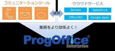 ProgOffice Enterpriseは、ビジネスで活用の多いクラウドサービスとコミュニケーション手段を連携できるツール。クラウドサービスの名刺管理「法人向け名刺管理 Sansan」、営業管理「Salesforce」や「Office 365」「Google Apps」のスケジュール帳と、「電話」「メール」「チャット」などのコミュニケーション機能を連動し、状況にあわせた最適な手段を表示する。これまでのように、複数のサービスを別々に起動する必要はなく、同製品だけで状況を確認しながらすぐに連絡をとることができる。