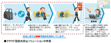 具体的には、ビーコンを鞄、ノートPCなどに取り付け、あらかじめスマートデバイスに設定した距離から離れた時点で、スマートフォンにアラームとバイブで通知する。また、アラーム通知と同時に紛失時点の位置を管理者など第三者宛にメール通知し、万一アラームに気づかない場合でも紛失した時刻と場所が確認できる。同製品を利用することで、企業全体として重要書類の入った鞄などの紛失防止に取り組むことが可能となる。