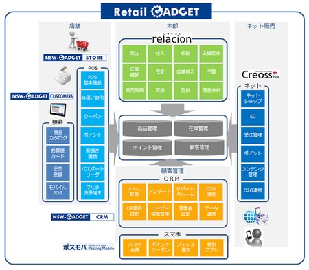 顧客管理システムの「NSW-GADGET CRM(ガジェット シーアールエム)」は、充実したマーケティング機能をもつCRMパッケージ。顧客・ポイント情報共有を実現し、オムニチャネル基盤を構築する。フュートレックから「Visionary」の提供を受けている。また、「ポスモバ」は、バックエンド機能の提供でモバイルアプリ開発をサポートするO2Oソリューション。会員属性や位置情報、ビーコンと連動し、プッシュ通知やクーポン配信などでスマートフォンによる来店・購買促進を支援する。