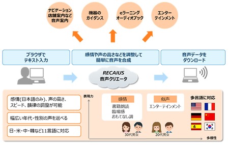 「音声クリエータ」は、自然で表現力豊かな音声により、テキストを音声化する音声合成機能を提供するクラウドサービス(SaaS)。ナビゲーションや店舗案内といった各種音声案内、eラーニングやオーディオブックなどのコンテンツ作成に活用できる。幅広い年代・性別の声で自然な音声を制作でき、日・米・中・韓・仏・独など11言語に対応している。また、喜びや怒りなどの感情表現も可能。人の音声の特徴(声質や韻律)を短時間の録音音声から高速学習する技術により、タレントやキャラクターの似声制作も可能なため、エンタテインメントや広告のコンテンツ作成にも活用できる。さらに、音声合成エンジンをPaaS(WebAPI)としても提供する。これにより、アプリケーションや既存システムへの音声合成機能の組み込みが容易になる。