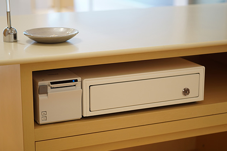 『TM-m10』とキャッシュドロアーをカウンター下の棚に設置