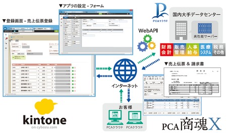 今回の連携ソリューションは、PCAが新たに開発したクラウドサービス間を連携する開発ツール「web API」を利用することで、販売管理業務で必要な得意先マスターや商品マスターの検索、売り上げデータの登録や在庫数の問い合わせなど、用途やニーズに合わせてkintoneからPCAクラウドに蓄積された基幹業務データにシームレスな連携を実現する。
