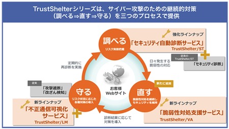 セキュリティ自動診断サービスは、ウェブサーバー上のアプリケーション(ウェブアプリケーション)のぜい弱性を突いたサイバー攻撃から企業内のサーバーを守るために、顧客のウェブアプリケーションをセキュリティの観点からチェックするサービス。従来の「TrustShelter/ST」は、技術者による「ウェブセキュリティ診断」だけを提供していたが、今回、インターネットから利用できる高速・精密な自動診断システムを新たに追加し、安価に提供することで、ラインアップを強化した。申し込み後すぐに利用できる。発売は12月1日の予定。