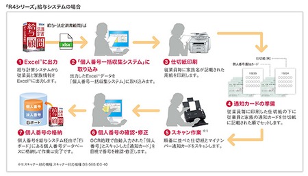 今回の個人番号の自動入力は、「マイナンバー通知カード」の原本と、給与計算システムからの従業員・家族マスターデータの情報が記載された「仕切紙(読取りシート)」を重ねてスキャンし、エプソン独自のスキャナOCR技術によって実現するもの。「マイナンバー通知カード」の原本をOCR処理することで、精度の高い個人番号入力の自動化を実現し、手入力作業に発生しがちな個人番号の入力・確認ミスを削減するとともに、個人番号入力業務の効率化を図る。