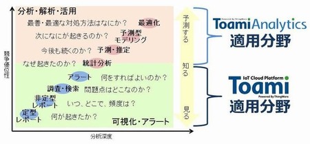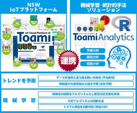 Toami Analyticsは、同社のIoTクラウドプラットフォーム「Toami」とシームレスに連携し、センサ、機械、人、インターネット情報などのあらゆるモノから収集した情報を逸脱度分析、相関分析、傾向分析、原因分析、予測分析など多角的に分析するサービス。さらに、過去データと実測データの差異を統計・分析する機械学習により高精度な予測が可能で、その結果にもとづく未来予測までを行う。また、分析基盤をクラウドで提供することで、低コスト・短期間で導入することができる。