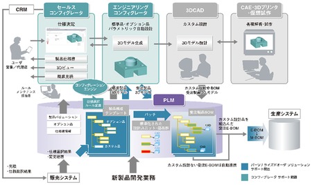 また、コンフィグレータ、PLM、3DCAD、ERPを連携し、仕様決めからものづくり(生産)までをオンライン化する。さらに、顧客の要望に合わせて、標準・準カスタム部品を自動的に組み合わせ、3Dモデルの設計パラメータを自動変更することで、従来の受注(営業)から設計、生産指示までの期間を大幅に短縮することができる。