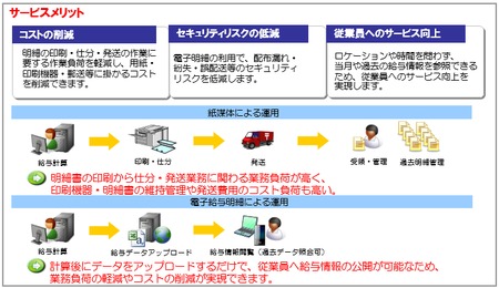 S-PAYCIAL with 電子給与明細サービスは、給与明細書をパソコン、タブレット端末、スマートフォン、フィーチャーフォンなどのマルチデバイスで閲覧できるサービス。給与明細書や賞与明細書の発行、その配布などの作業に費やしていた時間とコストを大幅に削減できる。また、配布ミスや配布漏れがなく、遠隔地などや多くの拠点で勤務している従業員にも迅速・確実に届けることができる。