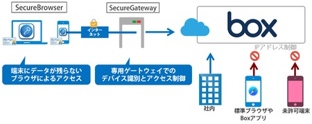 アクセス経路に応じたBoxの利用制限では、社外からのBox利用を閲覧のみに限定できる。Boxを利用する際は、セキュアブラウザアプリSoliton SecureBrowserを使用して、Boxにアクセスする。セキュアブラウザは、専用ゲートウェイを介してBoxに接続。Boxの接続元IPアドレス制御機能を用いて、社外での標準ブラウザやBoxアプリからの利用を禁止する。