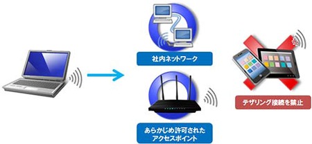 新バージョンでは、テザリング利用時のネットワーク制御を細分化し、スマートデバイス経由の情報漏えい対策を強化すると同時に、モバイル端末使用時に活用できる公衆Wi-Fiのアクセスポイントを管理することで、不審なネットワークへの接続によるセキュリティインシデントを防止する。