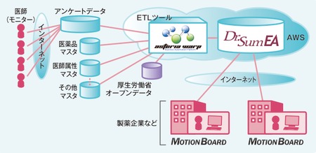 新システムのインフラには、システムの自由度・拡張性を考慮して、アマゾンウェブサービス(AWS)を活用し、エンドユーザー(製薬企業)がウェブブラウザベースのBI(ビジネスインテリジェンス)ツールで、分析作業を行うという仕組みを構想。多数の候補製品のなかから、BIツールには、直感的に利用できる使いやすさや機能性、サーバー単位の料金体系のコストメリットを評価して、ウイングアークのダッシュボード「MotionBoard」と集計エンジン「Dr.Sum EA」の組み合わせを選択した。
