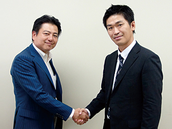 プロシップの山口法弘・取締役海外ビジネス営業本部本部長(右)と握手を交わすB-EN-Gの羽田雅一・常務取締役CMO/CTO