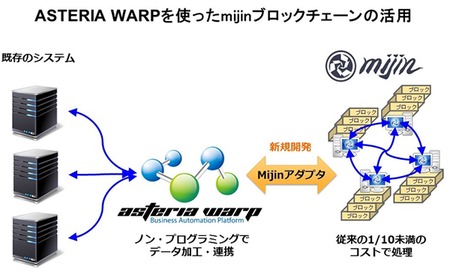 具体的な取り組みとしては、「ASTERIA WARP」とmijinを組み合わせた実証実験を16年1月に開始。また、国内金融機関にもブロックチェーン技術の採用・導入を推進するためのセミナーを共同開催する。さらに、テックビューロがASTERIA WARPの「mijinアダプタ」を開発し、4月に発売する。
