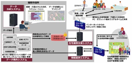 福岡市地域包括ケア情報プラットフォームは、福岡市が保有する医療・介護関連の各種データを集約する「データ集約システム」とこれらのビッグデータを分析し医療・介護に関する地域ニーズや課題を見える化する「データ分析システム」、要介護者に関する情報を家族や医療機関、介護事業者などが共有できる「在宅連携支援システム」、福岡市内の医療・介護・生活支援に関する最新情報をウェブサイト上で提供する「情報提供システム」で構成される。