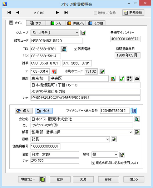 今回の「Ver.21」では、マイナンバーに対応。アドレス帳情報(個人/法人)にマイナンバーや社員番号、健康保険証コードなどを登録し、管理することができる。マイナンバー管理者用パスワードの新設により、起動時パスワードとダブルの堅固なセキュリティを実現した。従業員や扶養家族、取引先、株主など、マイナンバーの登録・管理、廃棄業務が安全・簡単に行うことができる。