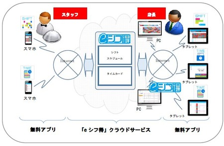 「e シフ得」クラウドサービスの使用イメージ eシフ得・シフトスケジュールサービスは、店舗側にPCまたはタブレット端末を、スタッフ側にはスマートフォンを用意するだけで、オンタイムでのシフト管理ができるサービス。いつでもPCのブラウザやタブレット端末上で、シフトスケジュールの作成や変更が可能となり、店舗管理者の業務負荷の軽減やシフト管理ミスの大幅な低減などを実現する。