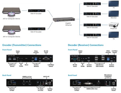 エンコーダ(送信機)とデコーダ(受信機)で構成され、入力デバイス(AVソース)と出力デバイス(ディスプレイやプロジェクター)にUSBなどで接続し、Cat5/6UTPケーブルまたは光ファイバーケーブルでギガビットEthernetスイッチに接続するだけで、自動的にIPアドレスを設定できる。高価なAV制御システムや、ネットワーク、AV制御の専門的な知識や経験は必要ない。Cat5/6UTPケーブルで100m離れた場所まで、光ファイバーを使うことで約10kmまで延長配信することができる。