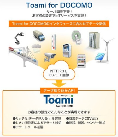 Toami for DOCOMOは、ドコモの3G/LTE回線を介してIoT機器やセンサから収集したデータを表示・活用することができるIoTクラウドサービス。IoTシステムを構築するうえで必要な機能を部品化し、柔軟に組み合わせることができるToamiの機能設定をさらに簡略化しており、顧客のシステム要件や規模に応じてIoTサービスを導入することが可能となる。