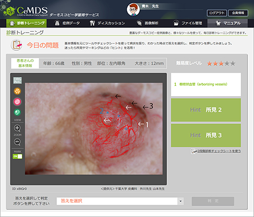 今回、新たに提供を開始したCeMDSは、外川八英助教(千葉大学大学院医学研究院)・山本洋輔助教(千葉大学医学部附属病院)の協力のもと、ダーモスコピー検査の撮影画像を所見付で収録した。さらに、収録画像と所見にもとづく設問を日替わりで出題する「診断トレーニング」機能と、ダーモスコピー検査の画像についてCeMDSの会員同士で討議できる「ディスカッション」機能も備えている。