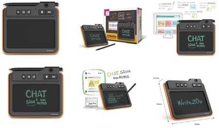 Write2Goは、ePaperを用いたBoogie Boardの技術を搭載し、5インチのタブレット端末ボード上にスタイラスペンで文字やイラストが手書きでき、そのまま筆跡が残るため、ユーザーは、紙の上に書くように全体を書いてからPC画面に送信することができるエコな制作・入力デバイス。手で書いた文字やイラストのメモの筆跡をそのままカラフルなデジタルメモとして取り込み、インスタントメッセージとしてそのまま投稿できる。FacebookやLine、Skypeなどを通じて、わかりやすさやなごみ感、個性などが伝わり、コミュニケーションの幅を広げることができる。