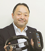 「BT-2000」を手に持つエプソン販売の蟹澤啓明・VP MD部部長 MOVERIO Pro「BT-2000」は、頭部に装着する両眼シースルーのメガネ型ウェアラブル端末で、長時間の使用に耐える装着性、500万画素のステレオカメラ、エプソンの独自技術で開発したセンサ「IMU(慣性計測ユニット)」をはじめとした各種センサを搭載していることが大きな特徴。これらの機能によって、作業現場における業務の効率化、ひいては働き方の改革を支援する。