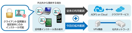 ADFS on Cloudは、クラウド基盤をプラットフォームとして利用し、Microsoft Office 365(Office 365)やさまざまなサービスをADと連携してシングルサインオンとアクセス制御を行うためのソリューション。SBTでは、15年5月にADFS on Cloudのオプション機能の一つとして、サイバートラストの証明書を用いたクライアント証明書オプションの提供を開始。その後、クライアント証明書オプションをADFS on Cloud以外の認証にも利用したいという顧客からの声を受け、利用範囲を拡充することにした。