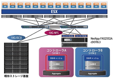 ナックでは、2012年に構築した自社プライベートクラウドのサーバー数が、当初の20台から90台に増えたことで、負荷の重い業務サーバーのレスポンスが低下する、バッチ処理の時間が延びるといった問題が生じていたことから、I/O性能の向上を重視して見直しに着手した。オールフラッシュ製品も含めて数多くの製品を検討した結果、ストレージ搭載のSSDをリード/ライトキャッシュとして利用する「Flash Pool」により、性能要件とコスト要件を無理なく両立できるソリューションとして、NetApp製ネットワークストレージNetApp FAS2552Aを選定した。