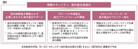 未来部は、市場を取り巻く環境の変化を大きなチャンスと捉え、同方案を策定。海外進出を加速するために、海外戦略拠点の構築(図1)や企業に合わせた進出支援、海外進出協力プラットフォームの構築、セキュリティベンダーのアビリティ強化などを図り、強力に支援していく方針だ(図2)。これらの取り組みによって、20年までの情報セキュリティの輸出規模を4.5兆ウォン(約4518億円)までに引き上げ、250社の海外進出企業の育成および情報セキュリティの専門性や力量を兼ね備えたグローバル人材1000名の育成を目標としている。