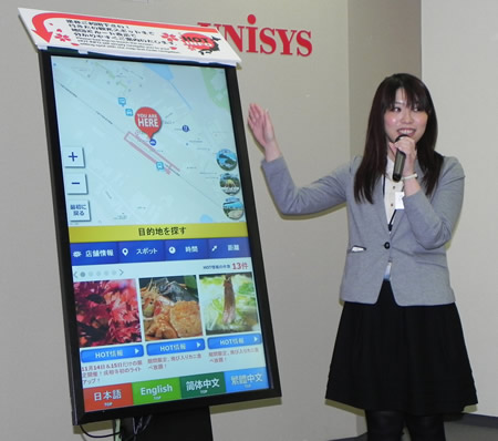 訪日外国人が年間2000万人に迫る勢いで伸びており、さらに2020年の東京五輪を見据えて、「国内観光ビジネスにおけるIT活用は一段と拡大する」(日本ユニシスの高橋潤一・エコシステム推進事業部サービス事業企画部長)と予測。デジタルサイネージの活用例では、英語や中国語など複数言語で表示させ、観光案内を行うことで、地元の人材だけでは難しい外国語対応をITで補完するニーズをつかんでいく。
