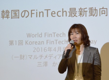続いて、一般社団法人マルチメディア振興センター情報通信研究部主席研究員三澤かおり氏が「韓国のFinTech市場動向」について講演を行った。現政権のスタート以来、ICT融合を成長エンジンとして起業の活性化を図ってきたと紹介。実際、13年~16年に医療、農業、教育、文化、観光、環境、金融などの分野で139件の個別プロジェクトが実施され、重点的にフィンテック分野を育成した結果、関連分野の起業が急増した。「15年5月、フィンテック企業の登録件数は44件だったが、11月には360件に増えた」とし、政府推進のフィンテック市場の活性化が、関連産業の従事者の雇用創出に貢献したと語った。