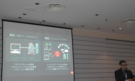 つづいて登壇した米モバイルアイアンのバリー・マインズプレジデント兼CEOは、「モバイルとクラウドの台頭により、エンドポイント・ネットワークアクセス・ユーザ情報のすべてをIT部門が管理していた時代から、デバイスとOSをユーザーが管理し、IT部門がすべてのインフラを保有していない時代になった」と、ユーザーを信頼するだけでなく企業のセキュリティレベル向上の必要性を訴え、今回の新製品発表の経緯を語った。