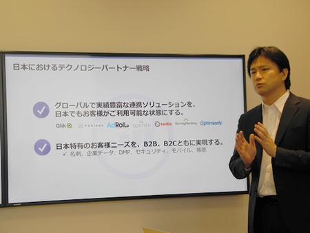 「デジタルやアナログ、名刺や電話といった従来型のエンゲージメントから最先端のテクノロジーまで、双方の顧客接点をカバーするプラットフォームを目指す」と語る小関貴志バイスプレジデント。現在7社の連携ソリューションを年内に15社まで増やすのが目標。グローバルで実績のあるものと日本特有のニーズを並行して拡充する。