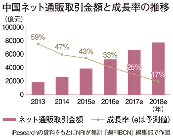 15年の中国の消費市場は前年同期比10.7%増、中国GDPに対する貢献率は66.4%と高く、中国経済の成長をけん引する。アリババや京東などのネット勢の高成長は、中国小売・流通・サービス市場に劇的な変化をもたらした。実店舗の閉店ブームは収まらない一方で、中国ネット通販市場(EC)は農村部向けECや越境ECなどの拡大により緩やかな成長を続けている(グラフ)。昨年は、「双十一(アリババのT-Mall・淘宝で開催した一日特別セール)」で一日の取引額912億元(約1兆7000億円)を記録した。しかし、その成功の裏には、高い返品率や物流コストの上昇、年末の売上減少など、出展企業の負担は大きく、EC市場の安定的な発展を阻害している。