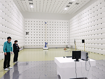 電波暗室には直径5メートルのターンテーブルを用意。製品を回転させながらノイズなどを測定する