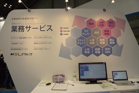OBCは主力商材の奉行10シリーズと連動するサービスを紹介。各企業がいよいよ本格的な対応を迫られるマイナンバー/ストレスチェック制度に対応した「マイナンバー収集・保管サービス」「ストレスチェックサービス」の2サービスに注力。どちらも奉行10シリーズのオンプレミス、クラウドともに連携できる。また、奉行10シリーズに50ユーザーまでが基本サービスとして含まれる企業内コミュニケーションサービス「Linkit」も合わせた3商材が今回の目玉となっている。