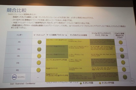 従来の製品にアドオンして提供される予定で、将来的にはDell SonicWALLユーザーの8割ほどに契約してもらえることを目指す。金額については明らかにしていないものの「コストパフォーマンスを重視した価格設定を考えている」(藤岡健セキュリティ営業本部長)。