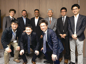 新田学事業部長(前列左端)ら、両社経営陣と営業チーム