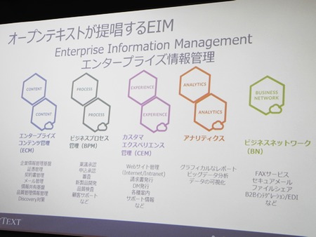 アクチュエイト社長の肩書ももつ早川社長は会見の冒頭で、「2015年1月にアクチュエイトを買収したが、いままでもM&Aを繰り返してきたこともあり、状況がどうなっているかわからないという声を多くいただいていた。実際に今はオープンテキスト、GXS、エクスパダイト、アクチュエイトの部隊が一つのオフィスで働いており、先日買収を発表したHPのカスタマ・エクスペリエンス・ソフトウェアの部隊もこれから入ってくる。BI、アナリティクス分野は注力分野ということもあり、なるべく早く説明してほしいということで今回の開催に至った」と経緯を話した。