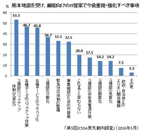 こうした被害の実態を受け、会員企業が顧客向けに提案を強化する項目としては、「IT施設のバックアップ体制」(53.3%)や「各種データのバックアップ対策」(46.7%)、「各種サービスのクラウド化」(45.8%)、「緊急対応体制の整備」(33.3%)、「事業継続のための代替策」(32.5%)などが多かった。