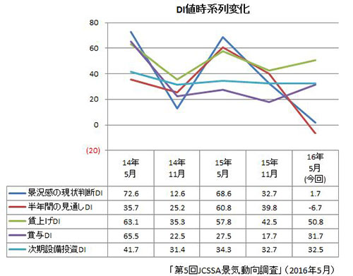 景況感判断については、現在の景況感を示す「景況感の現状判断DI」が1.7で、15年11月の前回調査比で-31.0ポイントを記録。今後半年間の景況感の見通しを示す「半年間の見通しDI」が-6.7も前回比-46.5ポイントと、いずれも低水準に終わった。しかし、半年後の業績見通しについては、41.7%の企業が増収増益と回答。また32.5%が減収増益として拮抗している。