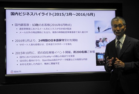 続いて登壇したスキャリティ・ジャパンの江尾代表取締役は、「オブジェクトストレージは2007年頃に一度波が来はじめ、一旦落ち着いたもののS3の登場によってリバイバルが起こりつつあり、今年は元年的なものになりつつあると感じている。昨年は法人設立や初の国内での自社イベント開催などを行ったが、引き続き啓発活動や24時間の日本語対応窓口の強化など、市場におけるリーディングベンダーとして今年も力を入れていく」と日本市場への注力を強調した。