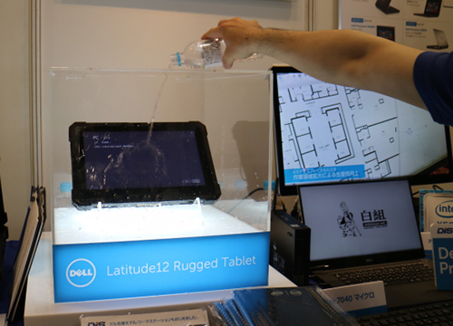 「プラットフォーム」ゾーンでは、サーバーやストレージ、パソコン、ルータ、スイッチ、UTMなど、大手ITメーカーのハードウェア製品などを展示していた。デルは、軍用規格の条件を満たす堅牢タブレット「Latitude 12 Rugged」の3モデルを展示し、水に浸けたり、床に落下してテストするなど強靱さをアピールするデモを行い来場者を驚かせていた。「地域では、建設や農業など厳しい環境下で仕事をする企業が多く、興味を示す方が多かった」と、好感触を得ていた。このほか、中堅・中小企業で簡単に導入でき運用が楽なハイパーコンバージドシステム「PowerEdge VRTX」を展示していた。