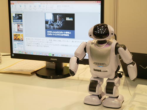 「次世代テクノロジー」ゾーンでは、ロボットやドローン、AI(人工知能)など、新しい商材を活用した法人向けのソリューションが多く展示されていた。このうち、DMM.comは高機能AIスマートロボット「Palmi」を使った名刺管理システム「sansan」や「Office365」との連携ソリューションを展示していた。また、ダイワボウ情報システムと連携し「DISロボティクスディベロッパーパートナー」を募集していた。「Palmi」をsansanなどのインターフェイスにすることで、オフィスコミュニケーションを改革する例を提示。「sansanで営業管理する企業では、Palmiを使って暫く営業に行っていない案件を音声で知らせることなどに使ってほしい」と話す。このほか、AIの活用では、Nextremerが対話型AIを搭載した対話システムを展示していた。