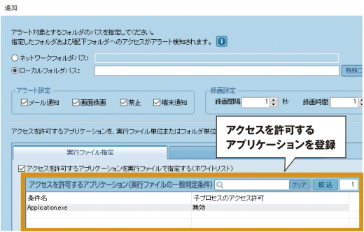 一方、サイバー攻撃など外部からの攻撃への脅威に関しても、複数の対策を講じた。まず、重要データが保存された特定フォルダに対し、許可したアプリ以外がアクセスするのを禁止した(図参照)。「マルウェアなどの悪意あるソフトウェアからのフォルダアクセスを防ぐ」ことで情報漏えいリスクを軽減する。また、ウイルス対策ソフトでウイルスを検知した場合は、対象パソコンをネットから自動遮断しつつ、制御は行える機能も搭載した。「すでに、マルウェア対策で効果を発揮している」と、新バージョンを使う顧客から評価を得ている。