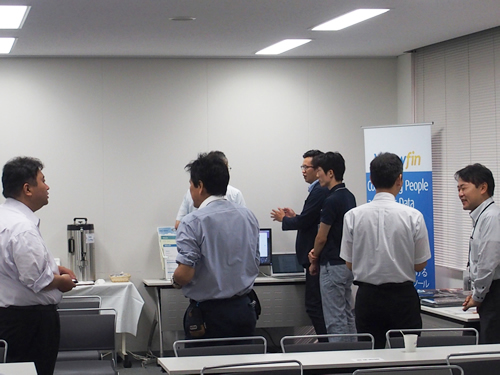 休憩時間の名刺交換。展示コーナーでは、セミナー参加者が積極的に質問していた
