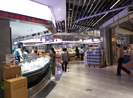 上海市浦東新区のショッピングモール「金橋国際商業広場」に今年1月、新たなスーパー「盒馬鮮生」がオープンした。足を運んでみると、店内には野菜や果物、日常用品に加え、新鮮なカニやエビなどの魚介類、外国産の高級牛肉など、鮮度の高い食料品が豊富に取り揃えてある。平日の昼間だったが、相当数の買い物客が入っていて、賑わいを感じさせる。