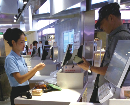 この店では、支払いはすべてアリババグループの「支付宝」を利用する。自分のアカウントのQRコードをみせて、レジ店員がもつ専用端末でスキャンしてもらうことで決済する仕組みだ。なじみの客が多いのだろう、レジ回りで支払い方法に困っている人はおらず、主婦も老人もみな「支付宝」で平然と会計をすませていた。