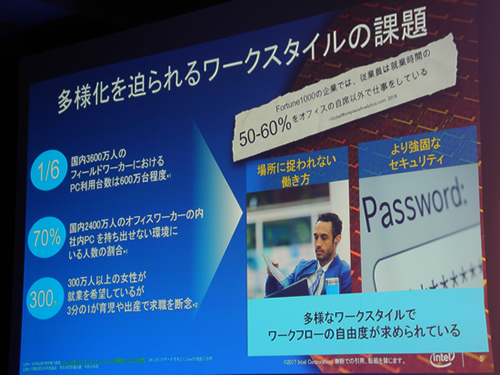 また、パートナーシップ企業として登壇したインテル(江田麻季子代表取締役社長)の江田麻季子代表取締役社長は、国内のPCを活用したワークスタイルの現状とFortune1000の企業の現状を比較。「国内企業のワークスタイルの現状は、必ずしもまだまだ先進的ではないのでは」と訴え、「第7世代インテルCoreプロセッサで、さまざまなワークフローの実現、オフィス内外でのセキュリティ向上を実現し、さらなる生産性の向上や働き方の充実が図れる環境を提供していきたい」と、パナソニックとともにワークスタイルの改善に貢献していくと抱負を語った。