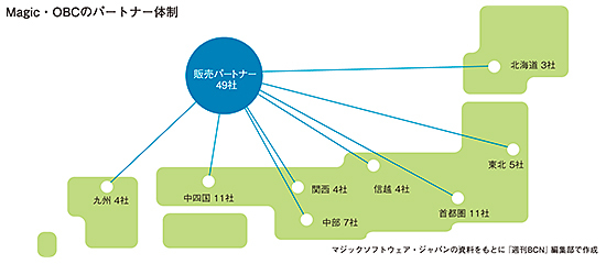 両社の協業の特徴は、全国のOBCパートナーとMagicパートナーが協力して販売することだ。マジックソフトの佐藤社長は、「全国のMagicパートナーがOBCパートナーに協力し、環境構築や運用、カスタマイズ、サポートなどの支援を行う」と、現段階で49社がスマホde営業支援 for 奉行を販売できる体制を整えた。
