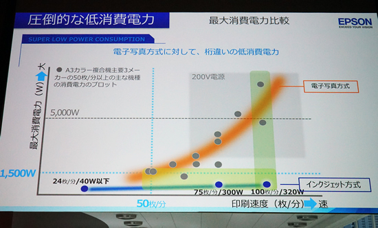 省エネ性能では、熱を使わずに非接触で印刷ができるエプソン独自のインクジェット技術「ピエゾ方式」を採用し、最大消費電力をパソコン約2台分の320Wに抑えた。速乾性に優れた顔料インクも新たに開発した。