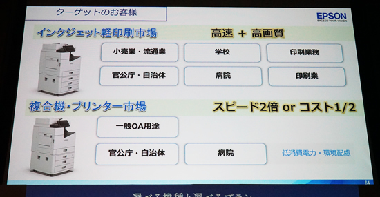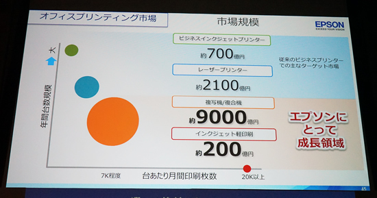 両社は、約9000億円の複写機/複合機市場と、約200億円のインクジェット軽印刷市場を「エプソンにとって成長領域」と分析。両市場を新製品の主なターゲットに設定し、さらなる市場拡大を目指す。